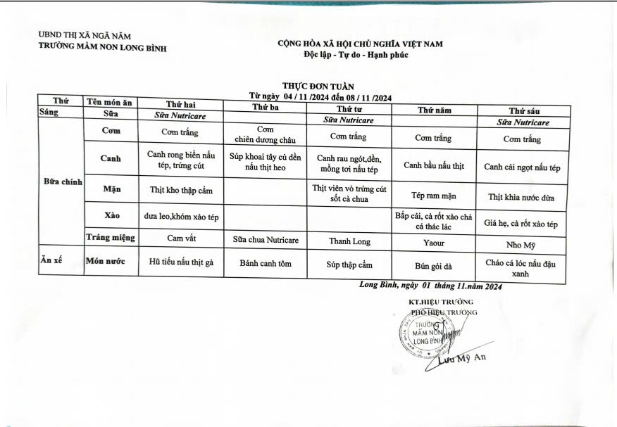 Thực đơn tuần từ 04-08 tháng 11
